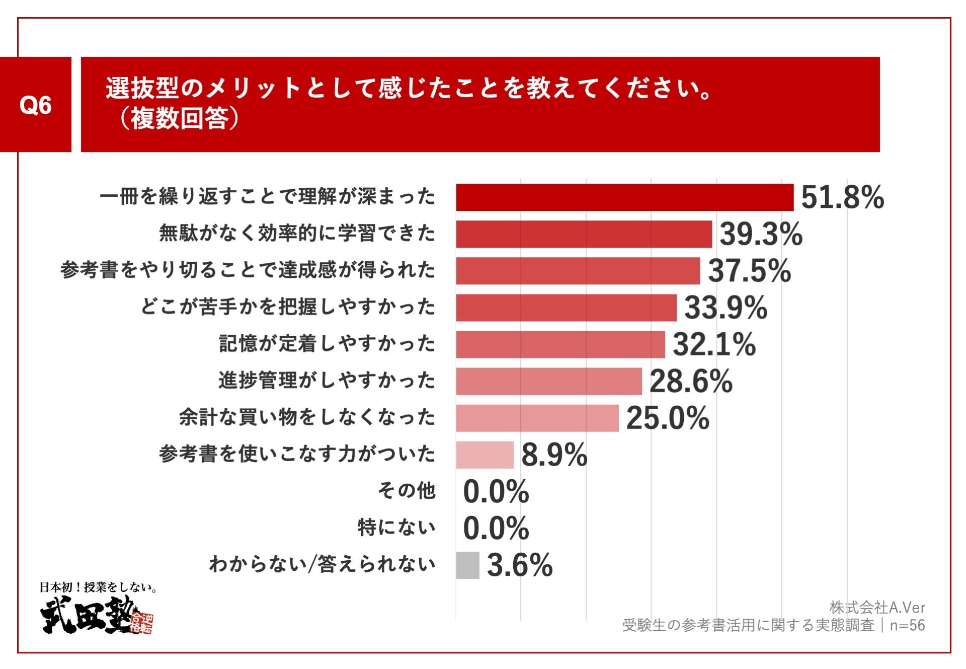 Q5で「選抜型」と回答した方に、「Q6.選抜型のメリットとして感じたことを教えてください。(複数回答)」(n=56)と質問したところ、「一冊を繰り返すことで理解が深まった」が51.8%、「無駄がなく効率的に学習できた」が39.3%、「参考書をやり切ることで達成感が得られた」が37.5%という回答となりました。