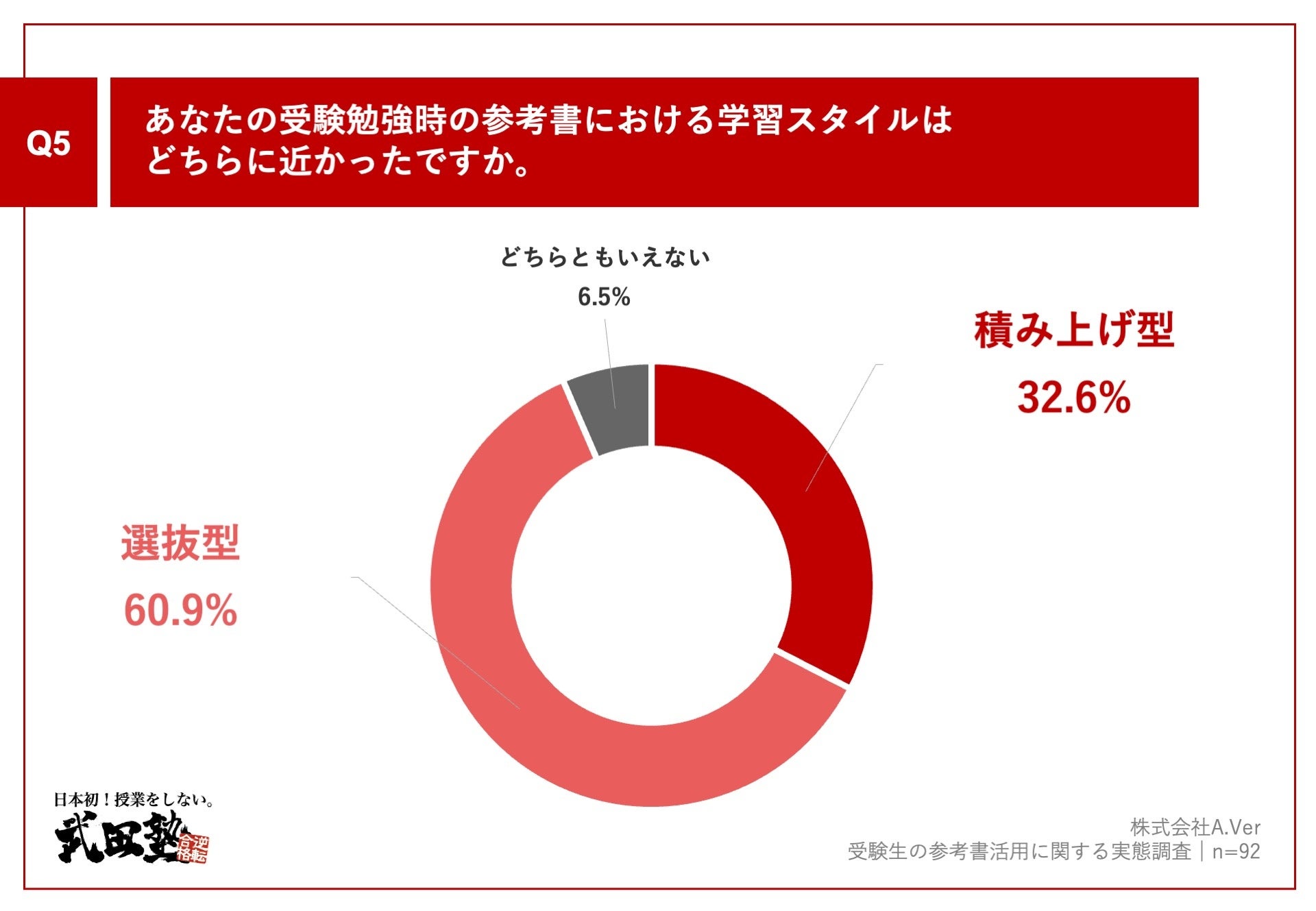Q1で「0冊」以外を回答した方に、「Q5.あなたの受験勉強時の参考書における学習スタイルはどちらに近かったですか。」(n=92)と質問したところ、「積み上げ型(複数の参考書を買い足しながら勉強を進めた)」が32.6%、「選抜型(参考書を絞り込んで購入し、それを徹底的に繰り返した)」が60.9%という回答となりました。