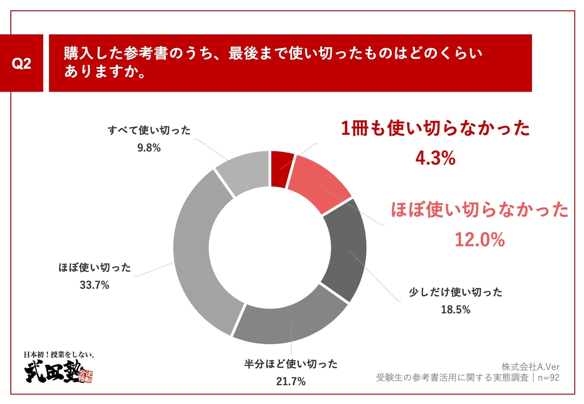 Q1で「0冊」以外を回答した方に、「Q2.購入した参考書のうち、最後まで使い切ったものはどのくらいありますか。」(n=92)と質問したところ、「1冊も使い切らなかった」が4.3%、「ほぼ使い切らなかった」が12.0%という回答となりました。
