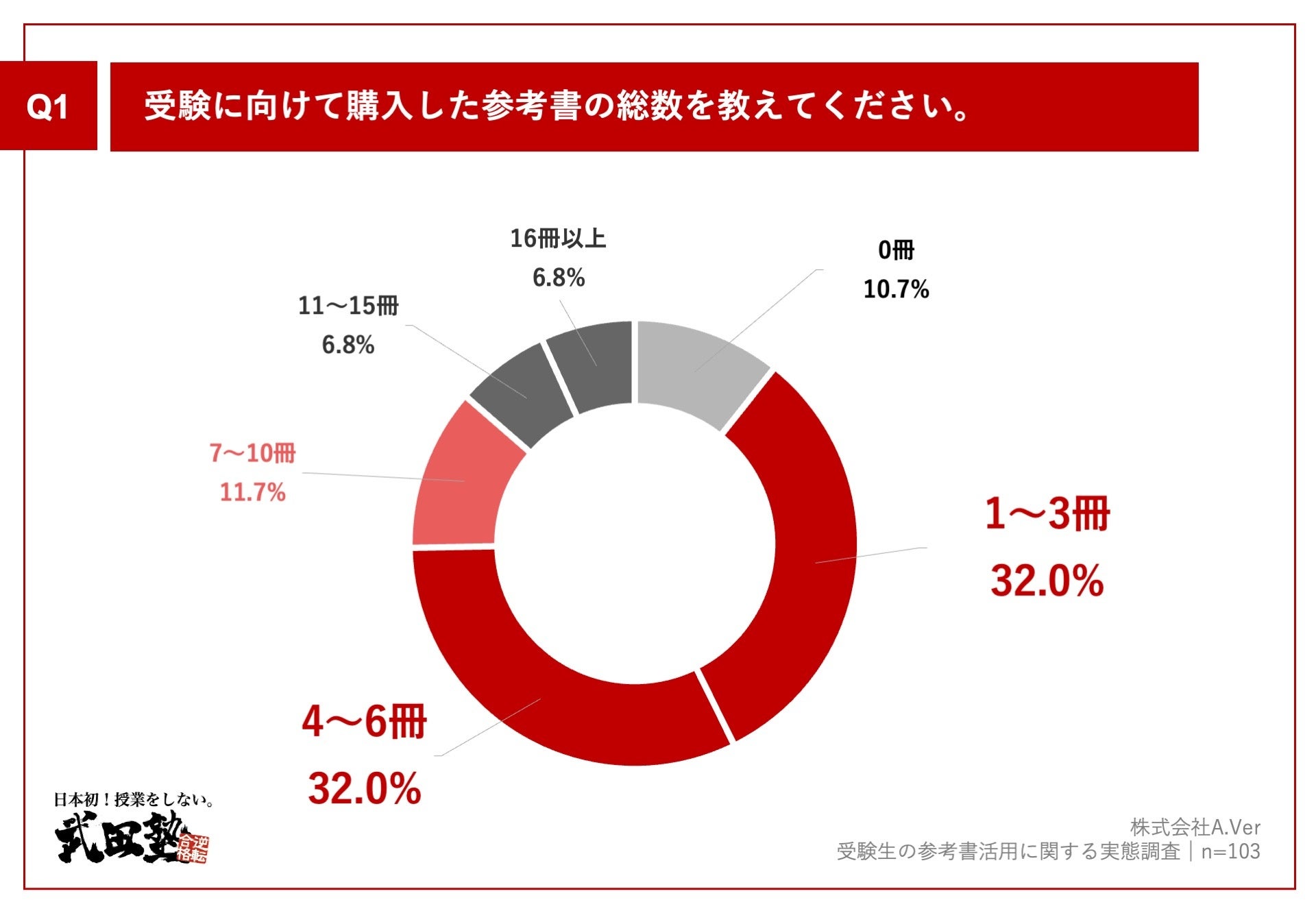 「Q1.受験に向けて購入した参考書の総数を教えてください。」(n=103)と質問したところ、「1~3冊」32.0%、「4~6冊」32.0%、「7~10冊」11.7%という回答となりました。