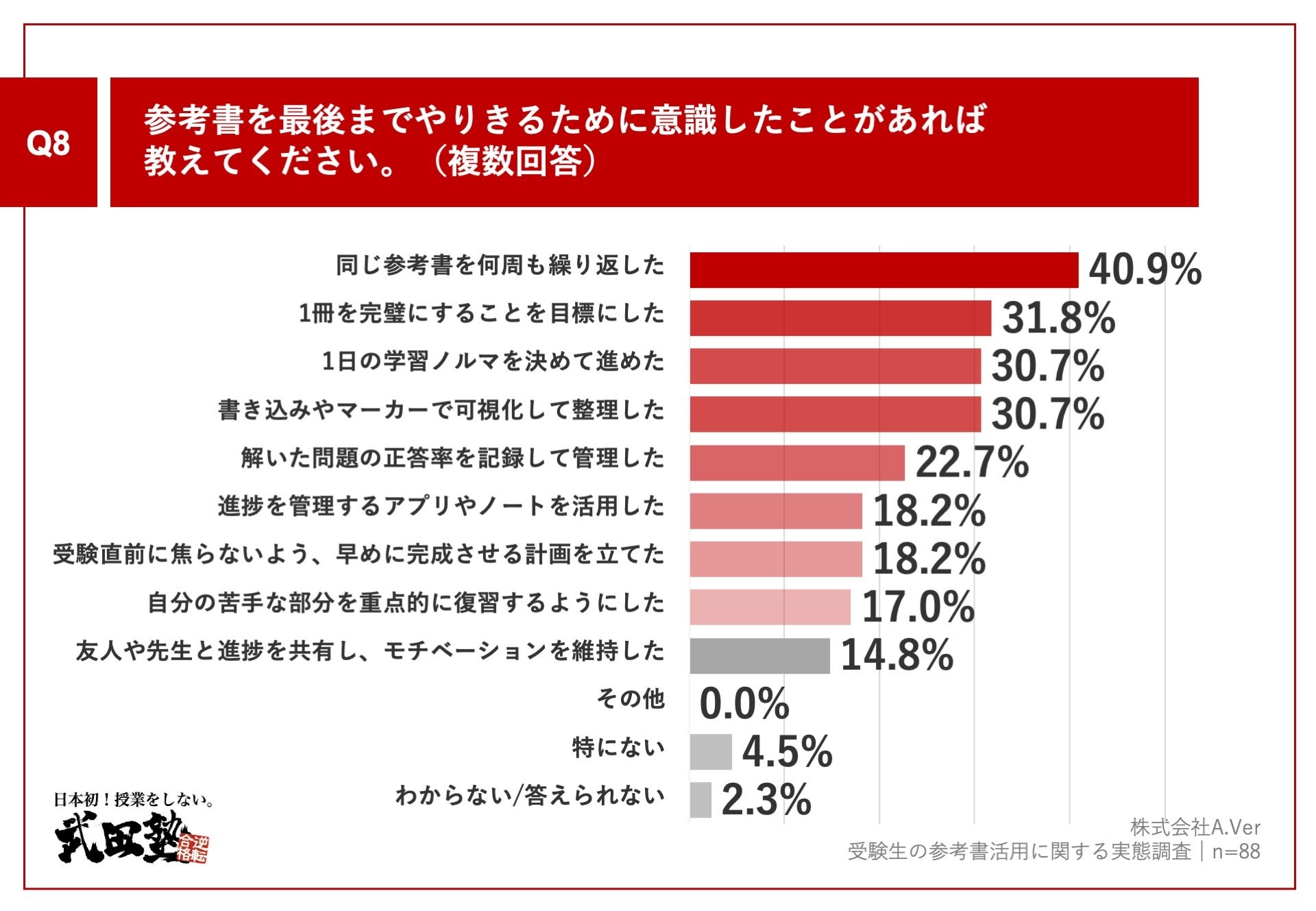Q2で「1冊も使い切らなかった」以外を回答した方に、「Q8.参考書を最後までやりきるために意識したことがあれば教えてください。(複数回答)」(n=88)と質問したところ、「同じ参考書を何周も繰り返した」が40.9%、「1冊を完璧にすることを目標にした」が31.8%、「1日の学習ノルマを決めて進めた」が30.7%という回答となりました。