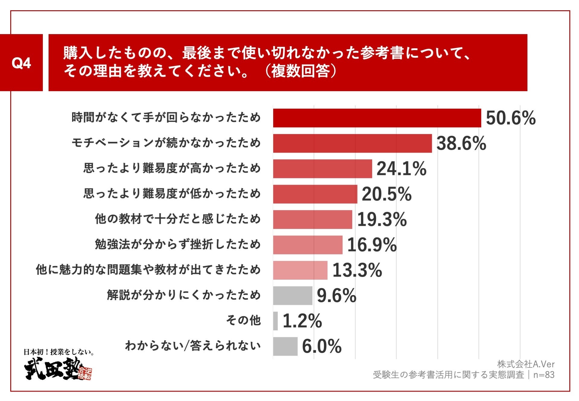 Q2で「すべて使い切った」以外を回答した方に、「Q4.購入したものの、最後まで使い切れなかった参考書について、その理由を教えてください。(複数回答)」(n=83)と質問したところ、「時間がなくて手が回らなかったため」が50.6%、「モチベーションが続かなかったため」が38.6%、「思ったより難易度が高かったため」が24.1%という回答となりました。