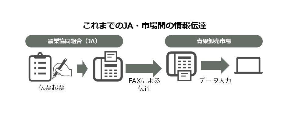 JAは生産者から青果物を集荷し、検品を行い、規格毎に集計、販売先に振り分ける分荷作業を経て、それぞれの市場向けに紙伝票を手書きで作成します。紙伝票はFAXを用いて市場に伝達され、市場側では、到着した伝票の内容をシステムに入力する作業をしています。このように、一般的な市場流通は、紙伝票やFAXによる伝達、目視による検品など、非常に多くの労力を要しています。また、情報を繰り返し、人の手によって入力・複製するため、情報精度が低下してしまうという課題があります。