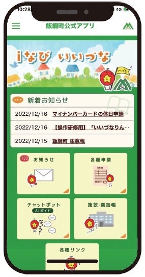 飯綱町では、1月18日から様々なサービスへのアクセスの起点となる飯綱町ポータルアプリ「iなび いいづな」と、窓口の混雑緩和と来庁者の利便性を高める「書かない窓口」がスタートします。住民のニーズに合わせた必要な情報がプッシュ型で届く、チャットボットで知りたいことがわかる、証明書がオンラインやQRコードで簡単に取得できるなど、デジタルの力を活用した便利な機能で、住民のみなさまが快適に過ごせるようお手伝いいたします。
