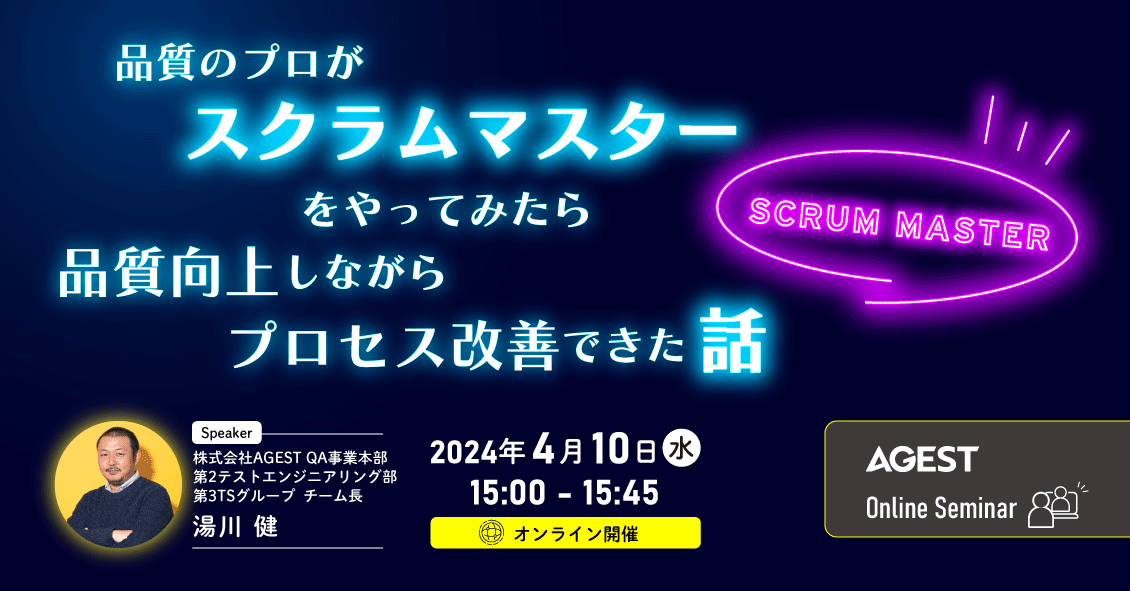 【2024年4月10日(水)開催無料オンラインセミナー】「品質のプロがスクラムマスターをやってみたら品質向上しながらプロセス改善できた話」を開催