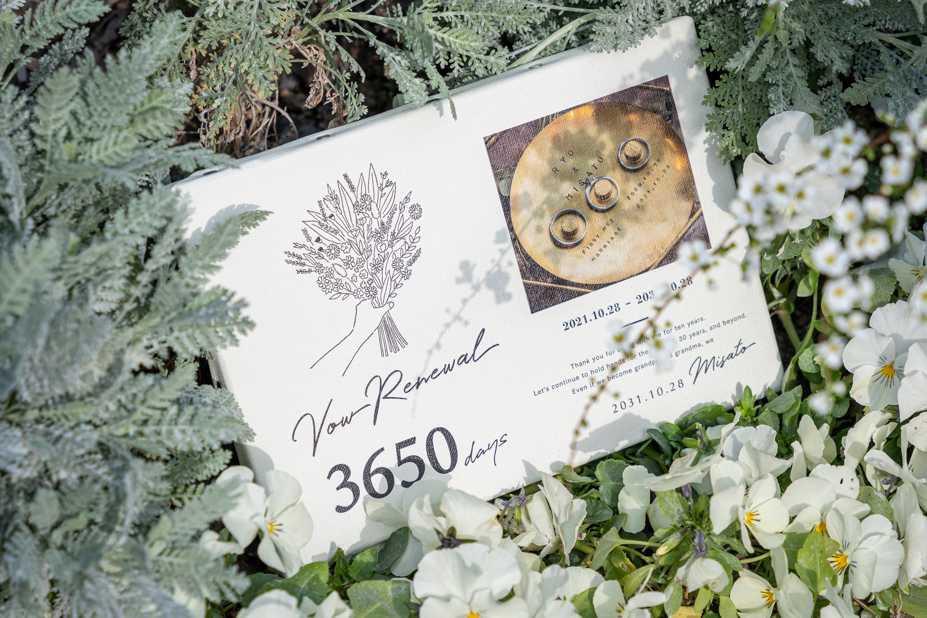 撮影の中で特に気に入った1枚は、記念日の日付やメッセージを添えて、「VOW RENEWALキャンバス」にし、お渡しいたします。毎年VOW RENEWAL(=誓いの更新)を行うことで、絆を確かめ合い、想い出として連ねて飾ることができます。