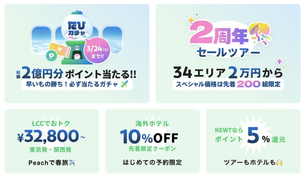 来たる2024年4月5日、NEWTは2周年を迎えます。これまで支えてくださった多くの皆様へ感謝の気持ちをこめてNEWT2周年セールを開催します。総額2億円分のポイントが当たるたびガチャや先着200名様限定の2万円から予約できるスペシャル価格のツアーなどをご用意しました。また、豪華ホテルのペア宿泊券が当たるSNSキャンペーンも同時開催します。これから約2ヶ月間に渡って皆様にお楽しみいただける企画をお届けしていきます。このおトクな機会に、ぜひ海外旅行をお楽しみください。