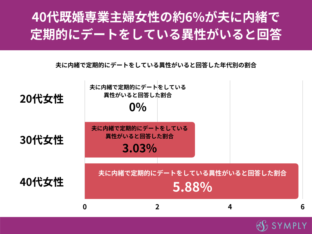 40代女性の専業主婦の内、およそ6%の方が夫に内緒で定期的にデートをしている異性がいることが分かりました。