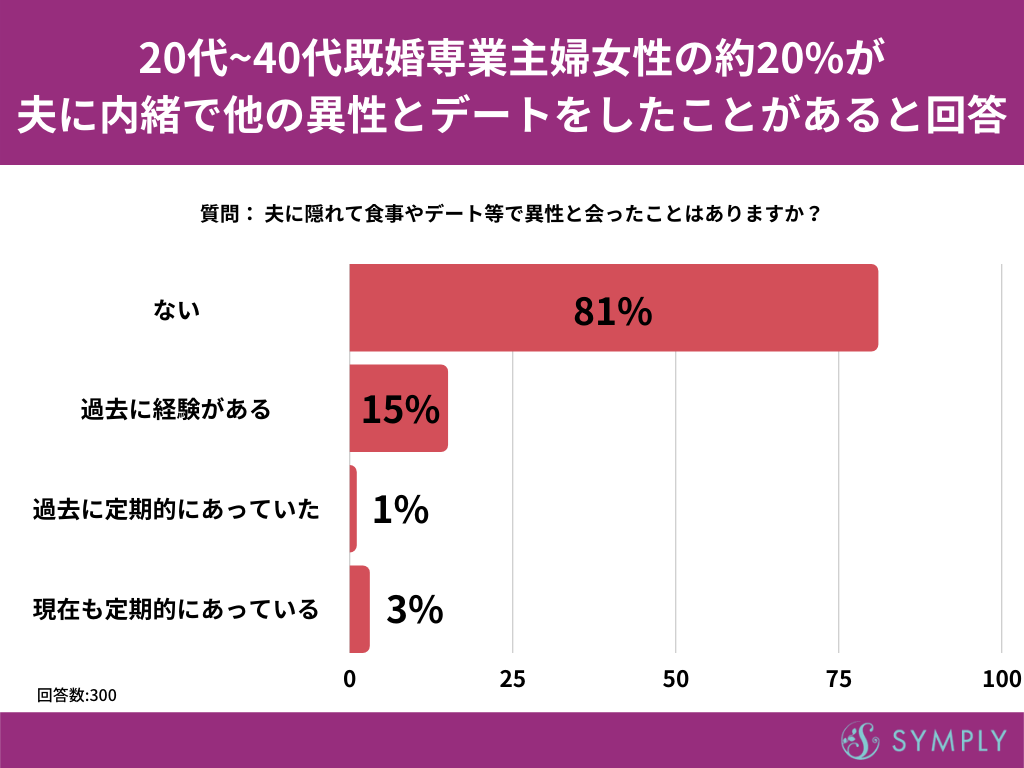 20代〜40代の女性を対象とした「夫に隠れて食事やデート等で異性と会ったことはありますか?」というアンケートで最も多かった回答は「ない」で81%でした。