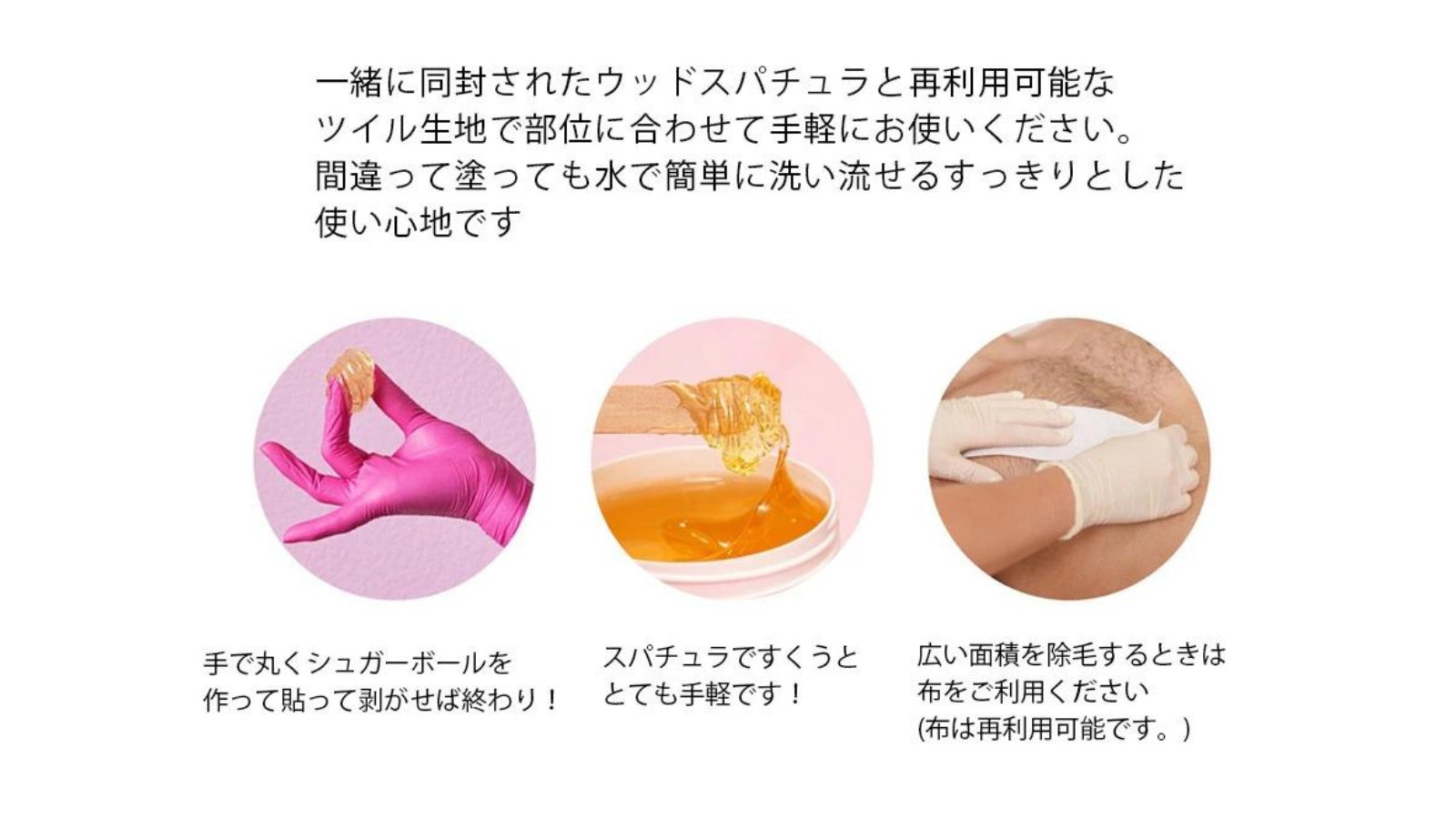 ・手で丸くシュガーボールを作って貼ってむだ毛が気になる箇所にON!ピリッと簡単に剥がせます。