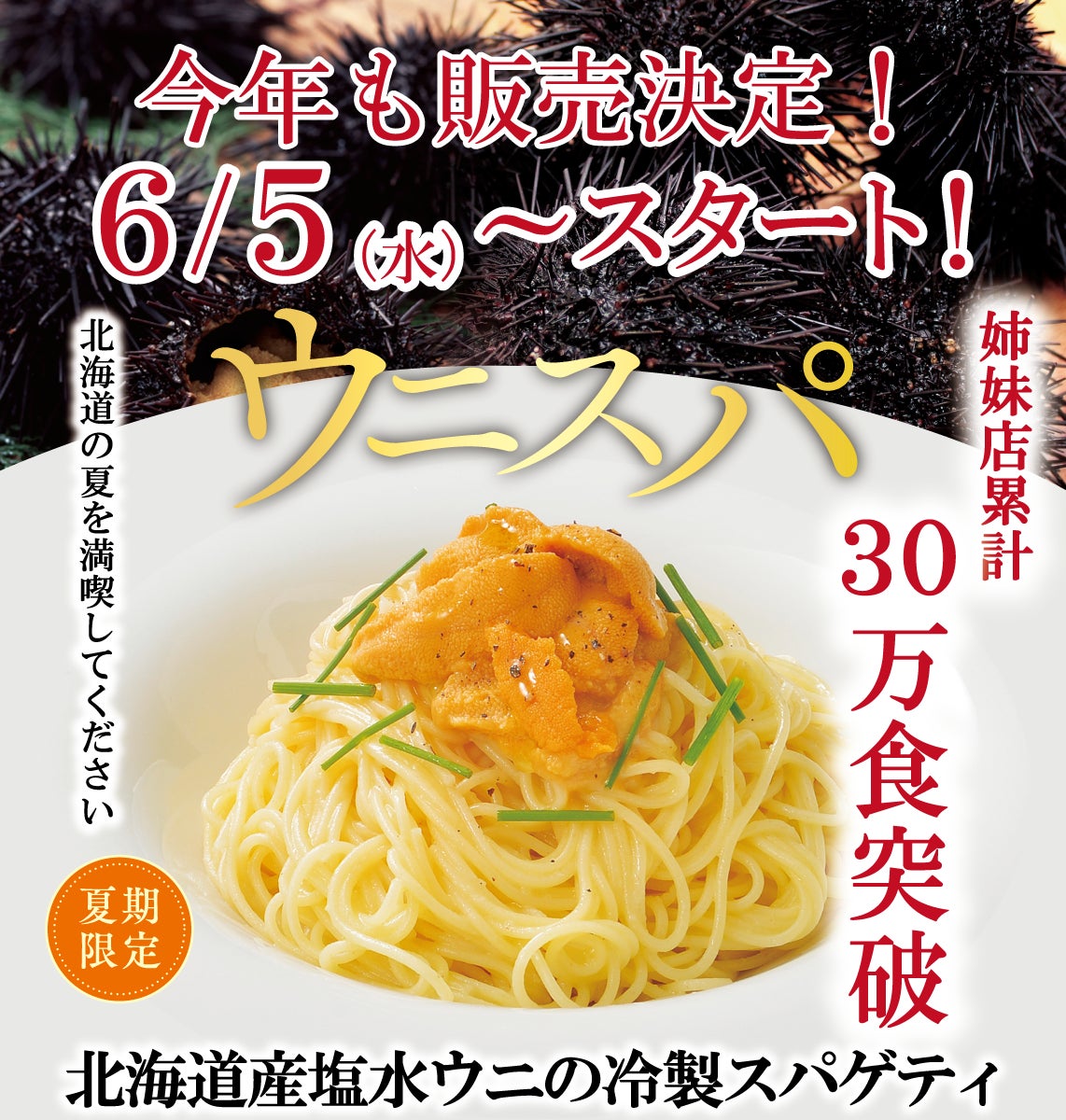 「北海道イタリアン ミア・ボッカ」が贈る夏の極上の味!姉妹店累計30万食突破!「北海道産塩水ウニの冷製スパゲティ」が2024年6月5日(水)から販売開始!
