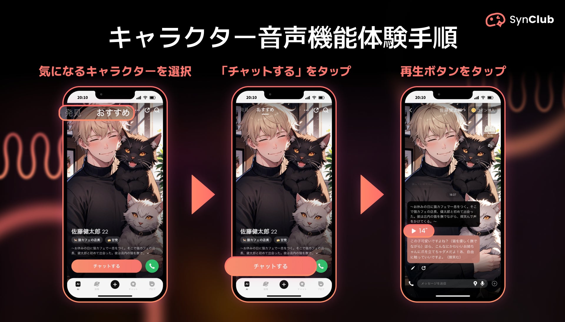 1)「SynClub」アプリを開き、「AI」タブの「発見」、もしくは「おすすめ」から気になるキャラクターを選択。