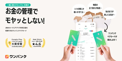 ワンバンクペアカードは、共同口座を2枚のVisaプリペイドカードで管理できる、アプリ連動型サービスです。あらかじめふたりそれぞれのアプリから共有の残高にチャージすれば、どちらかのカードで支払いが行われると、支払い履歴に反映されます。(公式サイト: https://onebank.jp/card/pair/ )