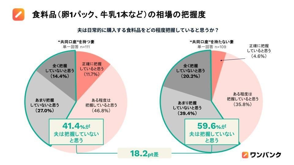 ■“共同口座”を持たない妻の59.6%が「夫は卵1パック、牛乳1本などの日常的に購入する食料品の相場を把握していない」と回答。“共同口座”を持つ妻と比べて、夫の相場把握度を18.2ポイント低く評価する結果に