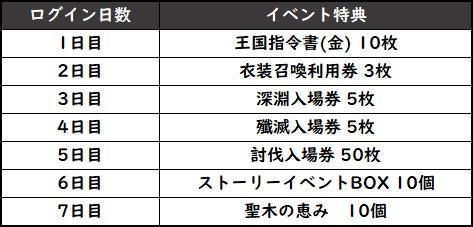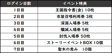 衣装召喚に使用できる「衣装召喚利用券」をはじめ、召喚に使える「聖木の恵み」など豪華な報酬が貰えますので、欠かさずログインしましょう!