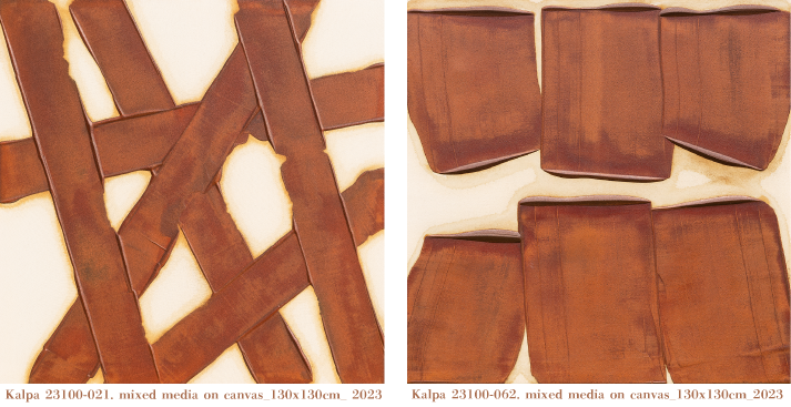 この「Kalpa(カルパ·劫)」シリーズはバランスを保っていた調和が、刹那のようにすれ違い、ついに消えてしまう過程を、メディウムと鉄粉を混ぜた赤褐色の絵の具を用いて、絵画の手法でキャンバス上に落とし込んだ作品で構成されています。イ・ギソンは鉄粉を錆びさせることで、作品に意味を込めます。 ここでの錆びは死を意味します。作品を鑑賞する我々は、キャンバスの中で真理を迎えることができます。イ・ギソンならではのシグネチャーシリーズです。