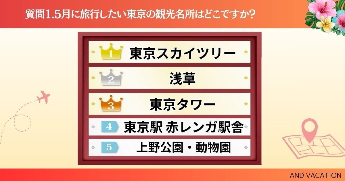 そこで、5月に旅行したい東京の観光名所を、アンケートで聞き取り調査をしました。ぜひ、チェックしてみてください!
