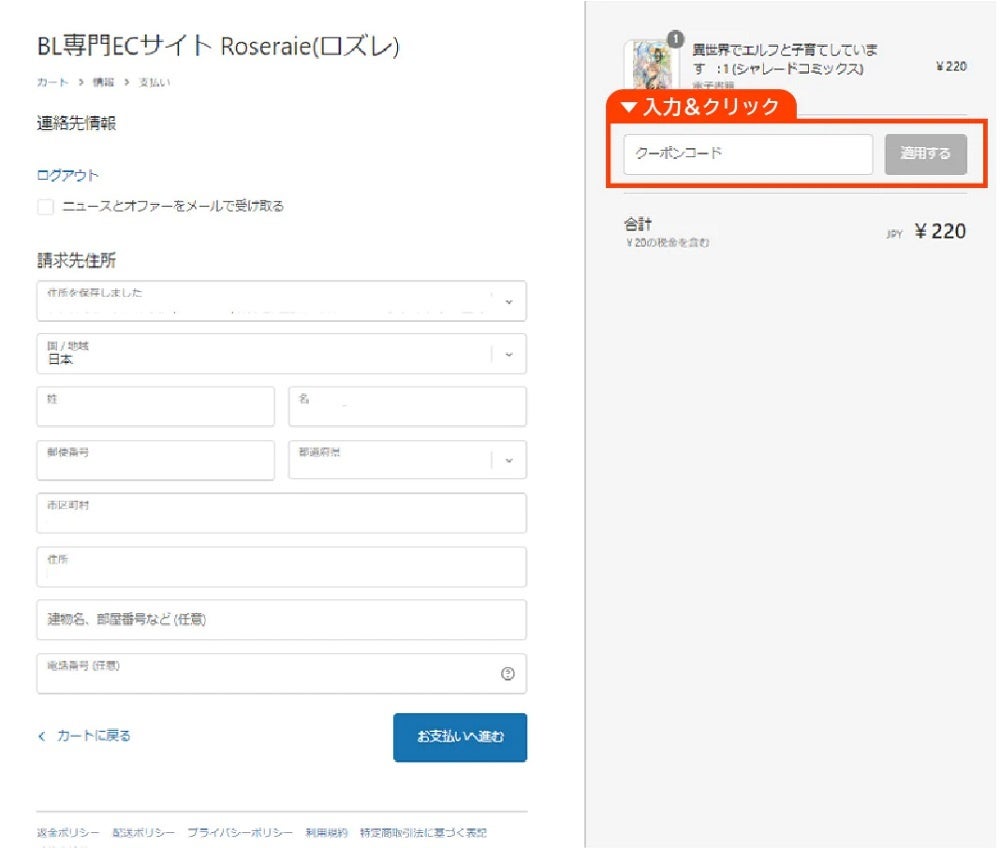 step3 右側にあるクーポンコード入力欄にクーポンコードを入力、適用するをクリック