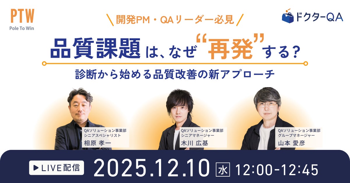 サービス・ライフサイクルにおける課題解決を支援するポールトゥウィン株式会社(本社:愛知県名古屋市、代表取締役CEO:橘 鉄平、代表取締役COO:志村 和昭、以下「ポールトゥウィン」)は2025年12月10日(水)にオンラインウェビナー「開発PM・QAリーダー必見 品質課題は、なぜ“再発”する? ― 診断から始める品質改善の新アプローチ」を開催いたします。