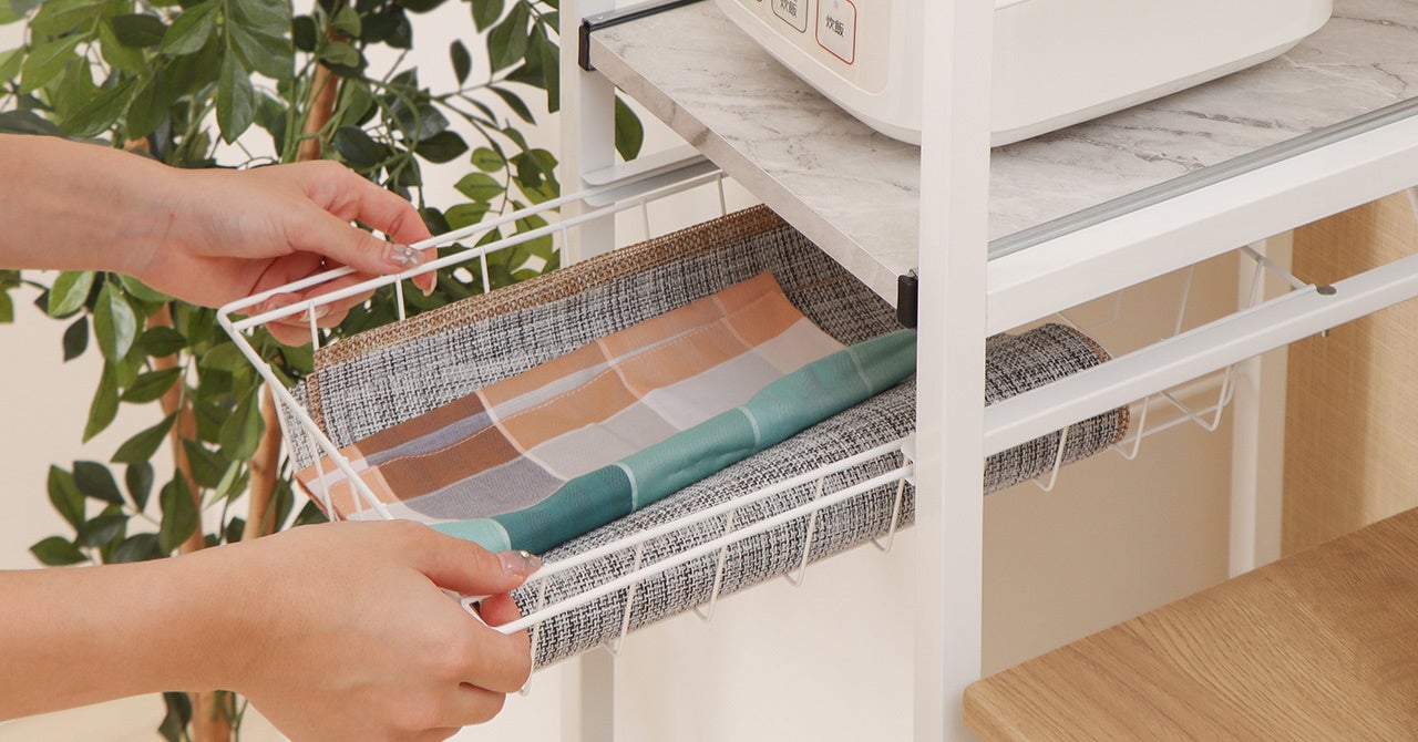 <ワイヤー引出し(かご)>引き出せるワイヤーかご付き。ストッパーを外すことで、取り外して使用することもできます。通気性が良いのでゴミ袋のストックや布巾、ランチョンマットなどの収納に便利。