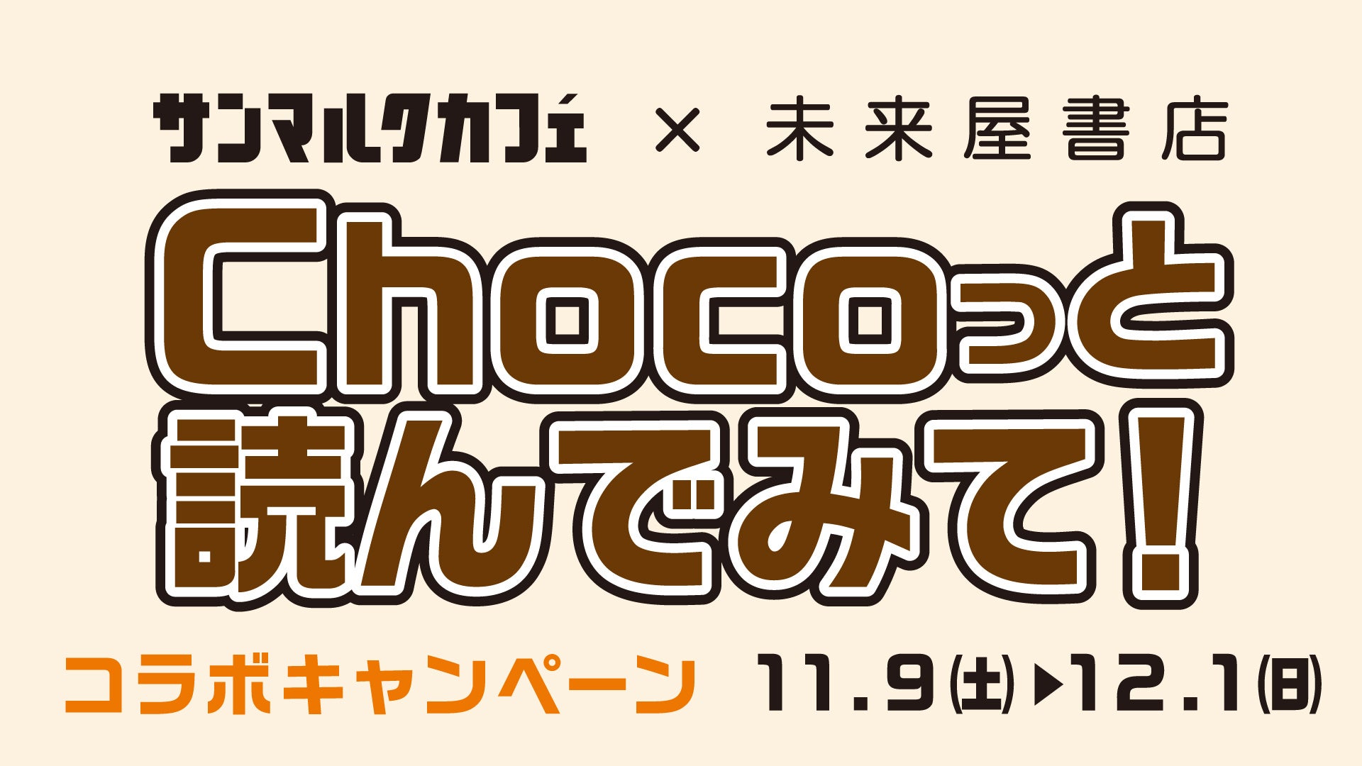 株式会社サンマルクカフェ(本社:岡山県岡山市 代表取締役社長:鎌田 滋之)と、株式会社未来屋書店(本社:千葉県千葉市美浜区、代表取締役社長:平川雅隆)は、11月9日(土)から12月1日(日)までの期間限定で「サンマルクカフェ×未来屋書店 Chocoっと読んでみて!コラボキャンペーン」を実施いたします。