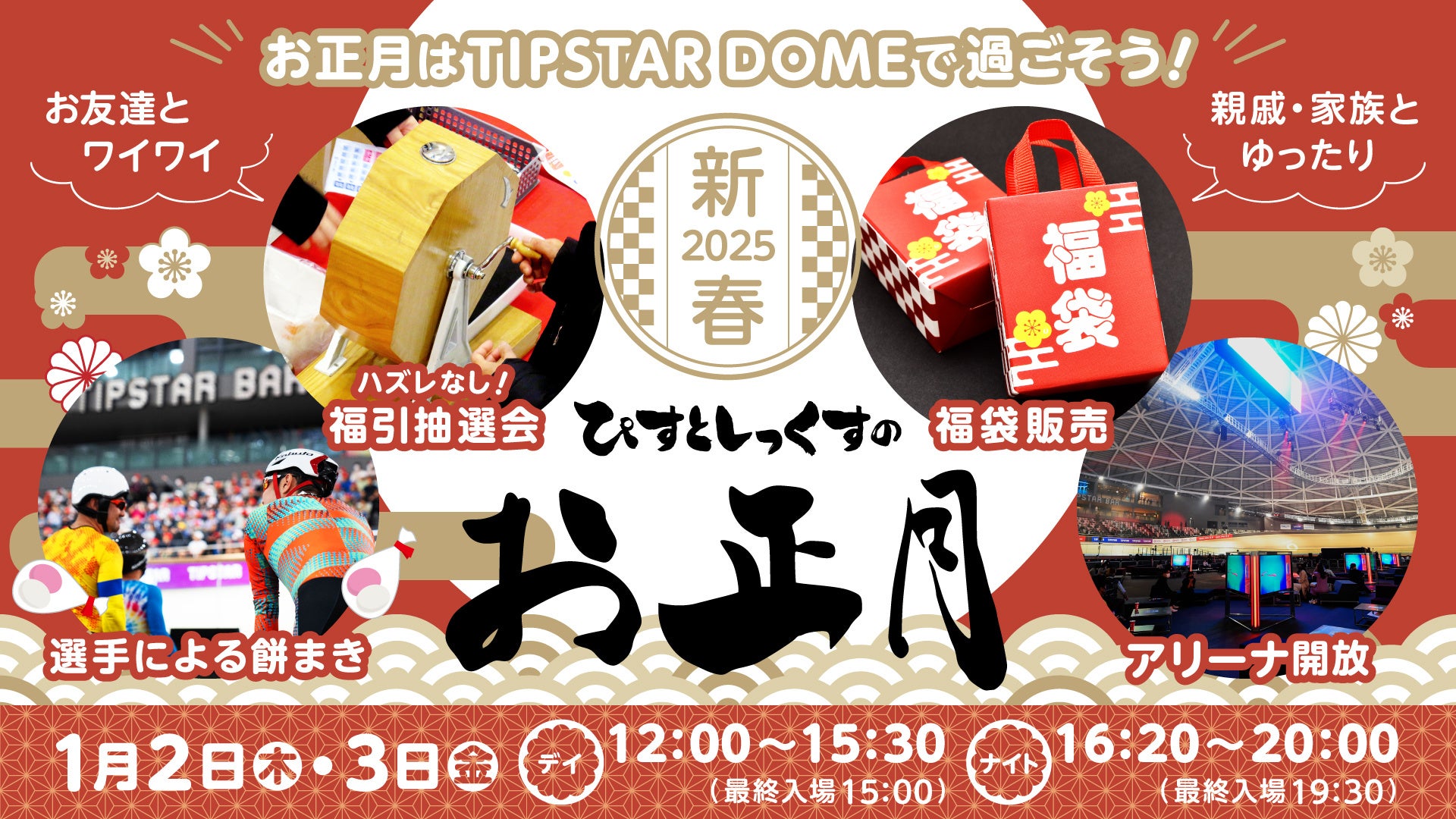 『ぴすとしっくすのお正月』は千葉市主催の新しいスポーツエンターテイメントであるPIST6の開催中、会場であるTIPSTAR DOME CHIBAにて行われるお正月イベントです。開催は各日二部制で昼の部(デイ)と夜の部(ナイト)に分かれます。屋内施設の為、天候や寒さを気にせずお楽しみ頂けます。大迫力のレースはもちろん、本開催ではお正月らしく福引きや選手からの餅まきなどのイベントも実施します。TIPSTAR DOME CHIBAで一風変わったお正月をぜひご家族やご友人とお楽しみください。