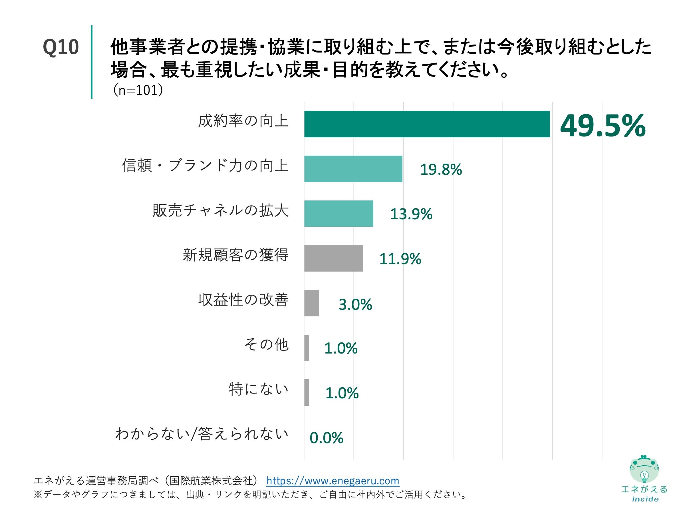 Q5で「非常にそう思う」「ややそう思う」またはQ9で「非常にそう思う」「ややそう思う」と回答した方に、「Q10. 他事業者との提携・協業に取り組む上で、または今後取り組むとした場合、最も重視したい成果・目的を教えてください。」(n=101)と質問したところ、「成約率の向上」が49.5%、「信頼・ブランド力の向上」が19.8%という回答になりました。