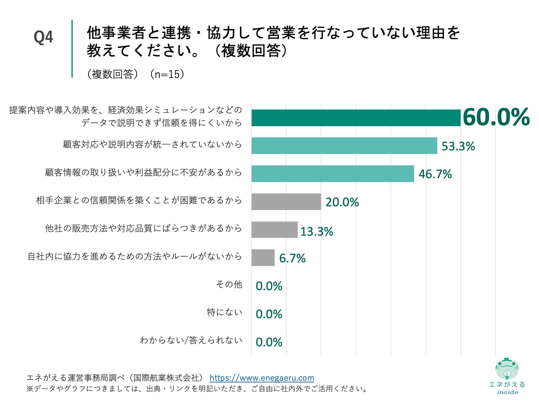 Q3で「いいえ」と回答した方に、「Q4.他事業者と連携・協力して営業を行なっていない理由を教えてください。(複数回答)」(n=15)と質問したところ、「提案内容や導入効果を、経済効果シミュレーションなどのデータで説明できず信頼を得にくいから」が60.0%、「顧客対応や説明内容が統一されていないから」が53.3%、「顧客情報の取り扱いや利益配分に不安があるから」が46.7%という回答になりました。