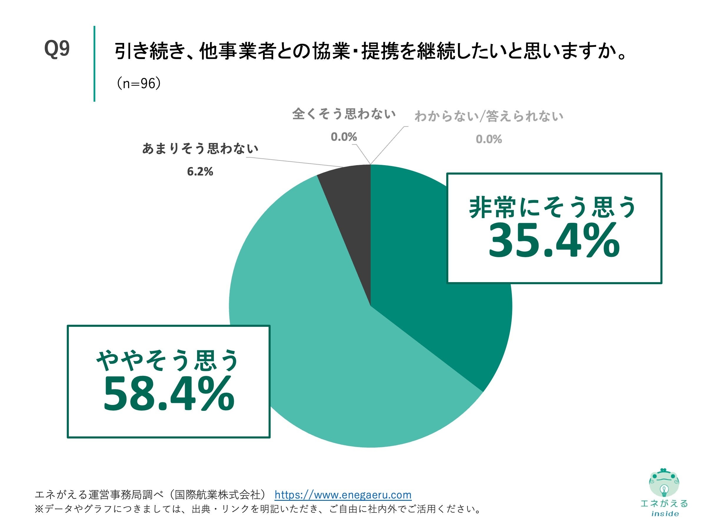 Q3で「はい」と回答した方に、「Q9. 引き続き、他事業者との協業・提携を継続したいと思いますか。」(n=96)と質問したところ、「非常にそう思う」が35.4%、「ややそう思う」が58.4%という回答になりました。