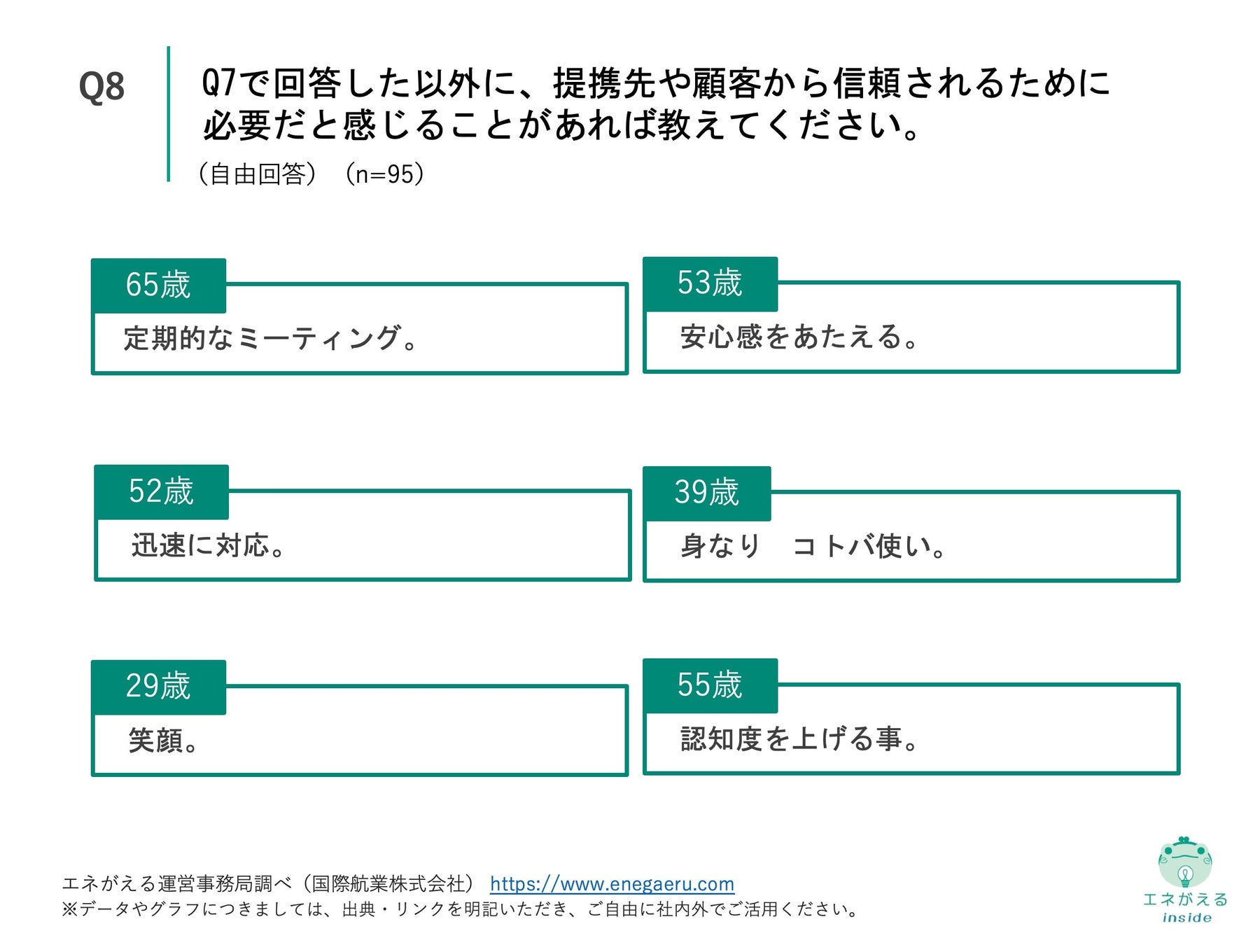 Q7で「特にない」「わからない/答えられない」以外を回答した方に、「Q8. Q7で回答した以外に、提携先や顧客から信頼されるために必要だと感じることがあれば教えてください。」(n=95)と質問したところ、「定期的なミーティング」や「迅速に対応」など61件の回答を得ることができました。