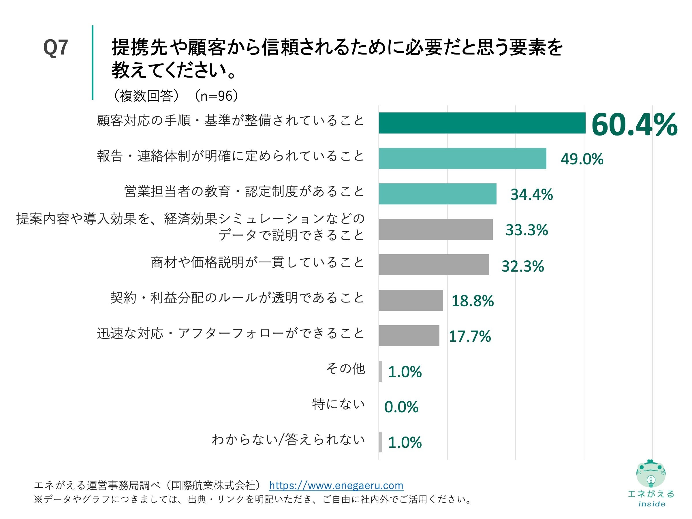 Q3で「はい」と回答した方に、「Q7.提携先や顧客から信頼されるために必要だと思う要素を教えてください。(複数回答)」(n=96)と質問したところ、「顧客対応の手順・基準が整備されていること」が60.4%、「報告・連絡体制が明確に定められていること」が49.0%、「営業担当者の教育・認定制度があること」が34.4%という回答になりました。