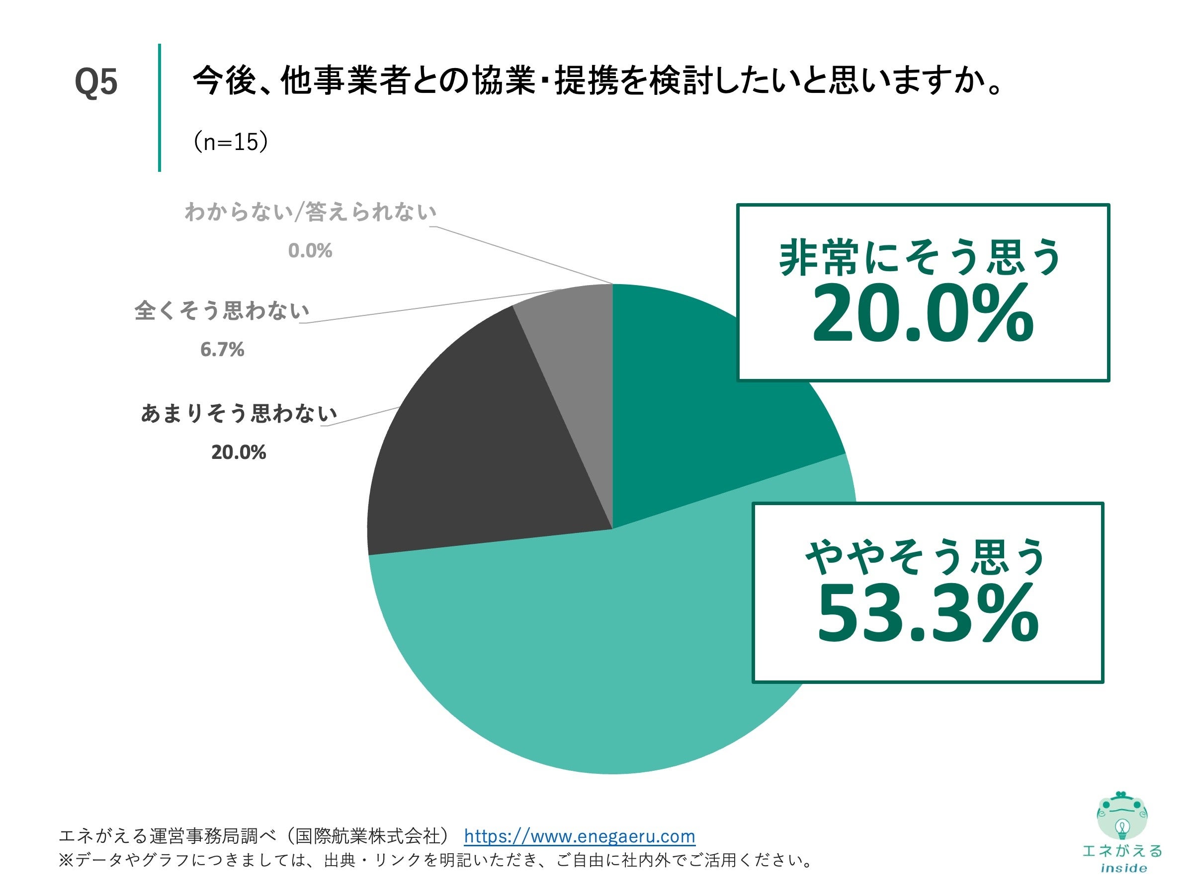 Q3で「いいえ」と回答した方に、「Q5. 今後、他事業者との協業・提携を検討したいと思いますか。」(n=15)と質問したところ、「非常にそう思う」が20.0%、「ややそう思う」が53.3%という回答になりました。