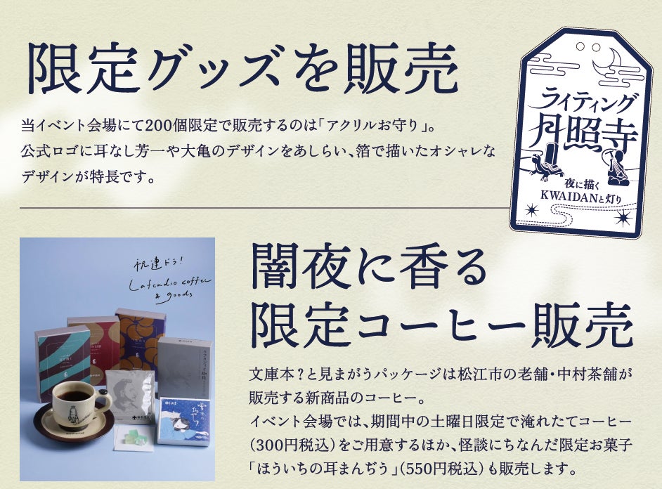 オリジナルグッズとしてアクリルお守り(800円・200個限定)を販売。期間中の土曜日には小泉八雲に着想を得た松江市の老舗・中村茶舗の特性コーヒー(ドリップ300円、テイクアウト用パッケージ商品は1000円)のほか、怪談関連の商品として中浦食品からは「ほういちの耳まんじう」も販売します。