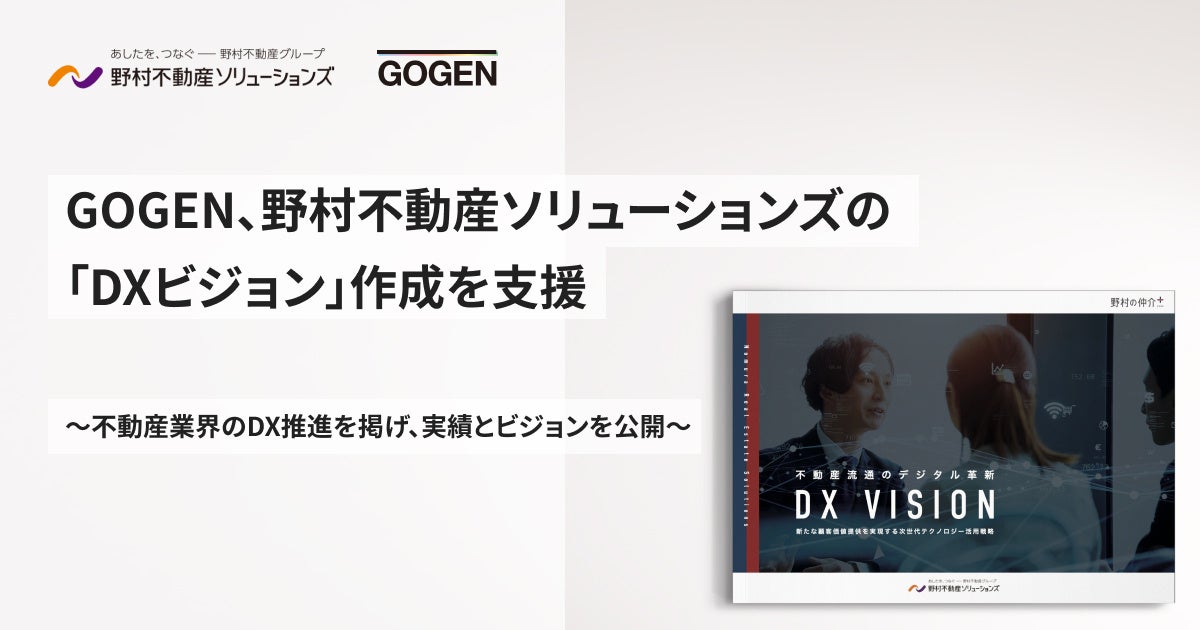 不動産売買支援ハブ「レリーズプラットフォーム」をはじめとした不動産売買のDX推進サービスの開発・提供を行うGOGEN株式会社(本社:東京都港区、代表取締役CEO:和田 浩明、以下:GOGEN)は、個人・法人向け不動産仲介事業等を展開する野村不動産ソリューションズ株式会社(東京都新宿区/代表取締役社長:前田研一、以下:野村不動産ソリューションズ)の「DXビジョン」作成を支援しましたので、お知らせいたします。