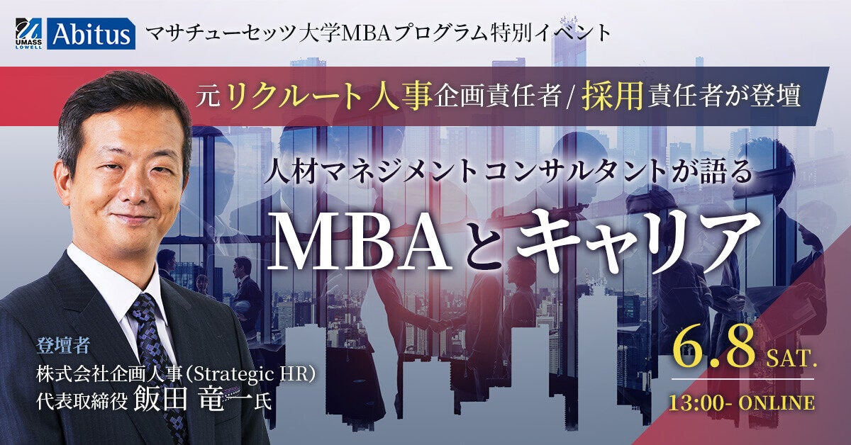 留学不要、完全オンラインで米国MBA(経営学修士)を取得できる「マサチューセッツ大学MBAプログラム」事務局は6月8日にリクルート株式会社での全社人事企画責任者や全社採用責任者の経験もあり、現在は人材マネジメントコンサルタントとして株式会社企画人事(Strategic HR) の代表取締役を務めていらっしゃる飯田 竜一氏をゲストにお迎えし、人事コンサルタントから見たMBAとキャリアについてお話を伺うイベントを開催します。