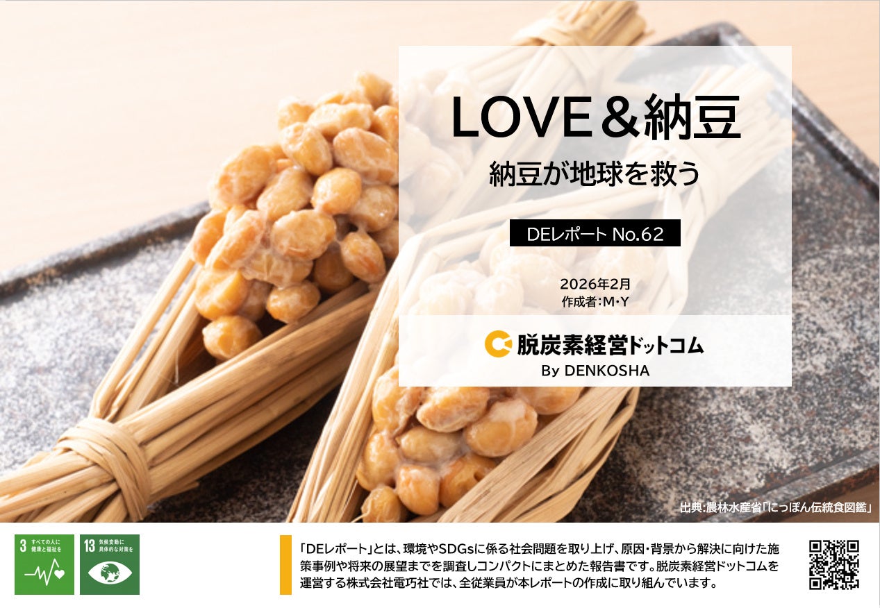 「RE100」の中小企業版「RE Action」に加盟し、脱炭素経営を推進する電巧社(本社:東京都港区、代表取締役社長:中嶋 乃武也)が運営する「脱炭素経営ドットコム」監修で、「納豆」に関する実態調査を行い、レポートとしてまとめました。