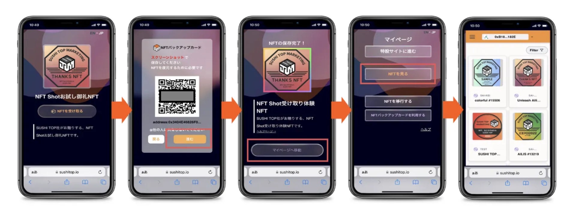 本方式は、弊社の基幹ソリューション「NFT Shot」として提供されています。URLのクリックやQRコードを読み取るだけでNFTを即時に受け取れる画期的な体験設計であり、当社は創業以来、セブン銀行ATMをはじめ、数多くの企業・自治体に対して本特許技術を活用したNFT配布ソリューションを提供してまいりました。SUSHITOPMARKETINGは、この領域のパイオニアとして、NFTマーケティングにおける新たなスタンダードを築いて参ります。
