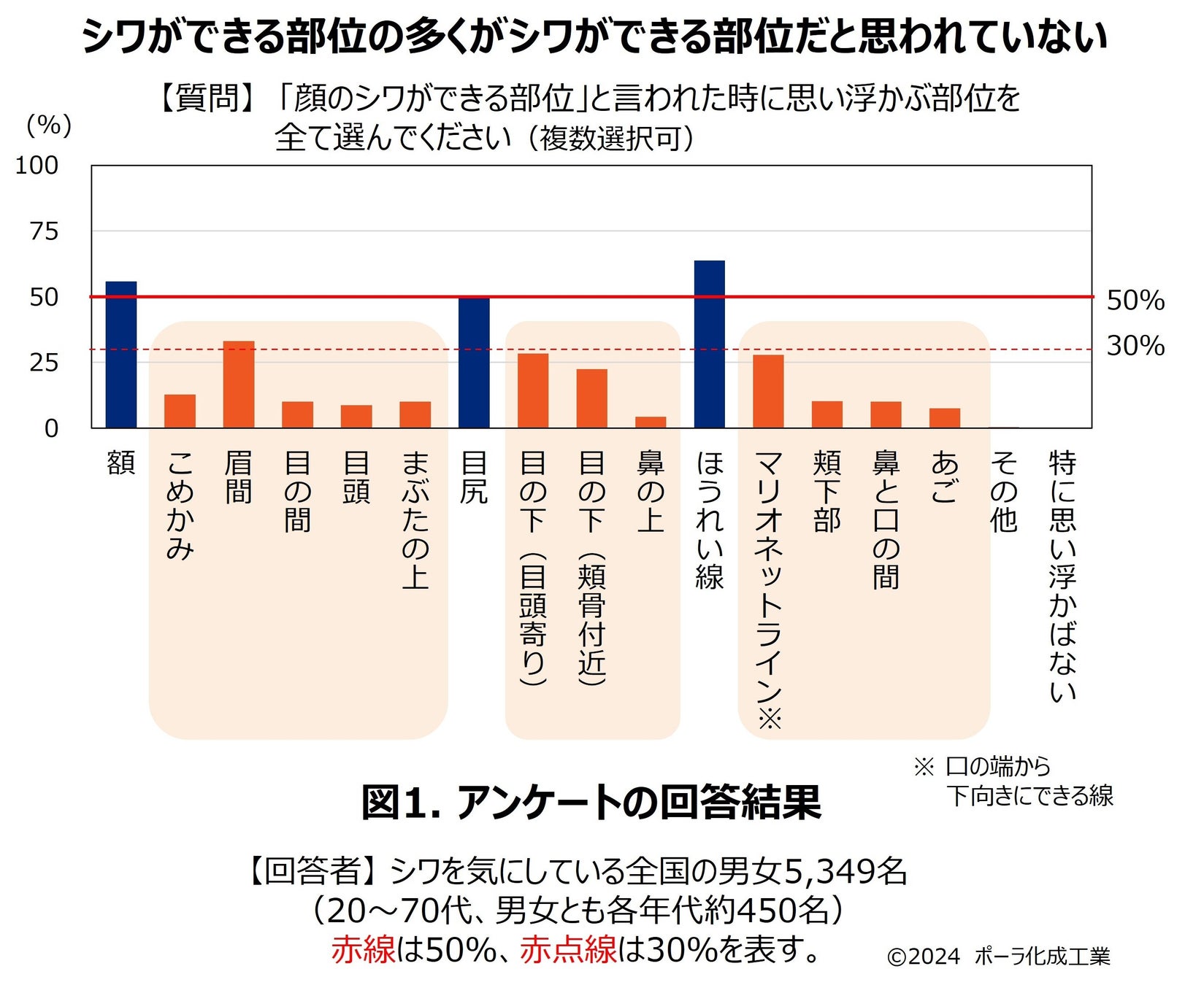 ポーラ・オルビスグループの研究・開発・生産を担うポーラ化成工業株式会社(本社:神奈川県横浜市、社長:片桐崇行)は、顔のシワを気にしている全国の男女にアンケートを行いました(※1)。顔の中でシワができることが広く認識されているのはほうれい線、額、目尻の3カ所だけで、それ以外の部位はシワができる部位としてあまり認識されていないことが明らかとなりました。