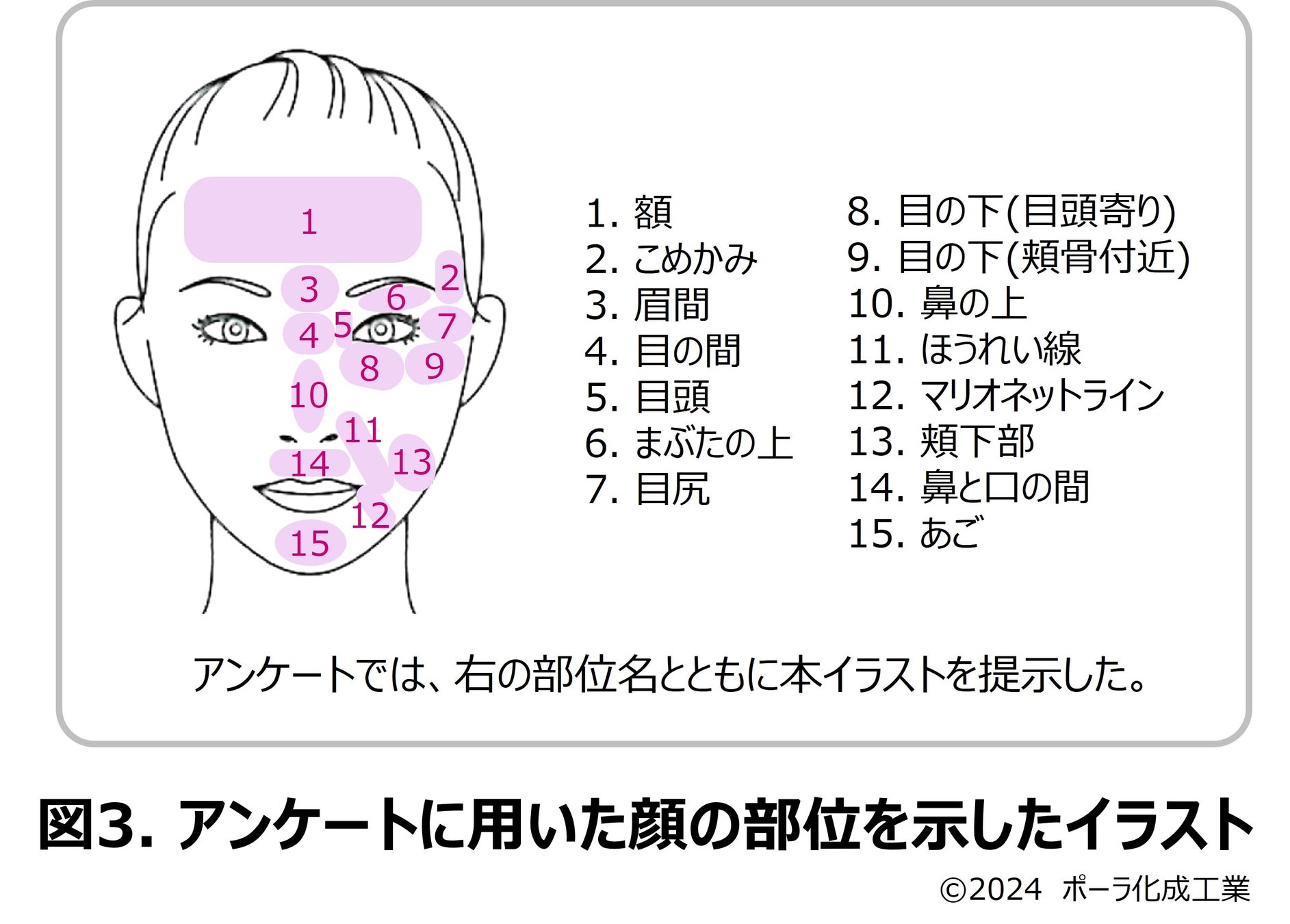 インターネット上で、シワができることが確認されている15部位を示したイラストとそれらの部位の名称を提示し(図3)、「シワができる部位」と言われた時に思い浮かぶ部位を全て選んでいただきました。