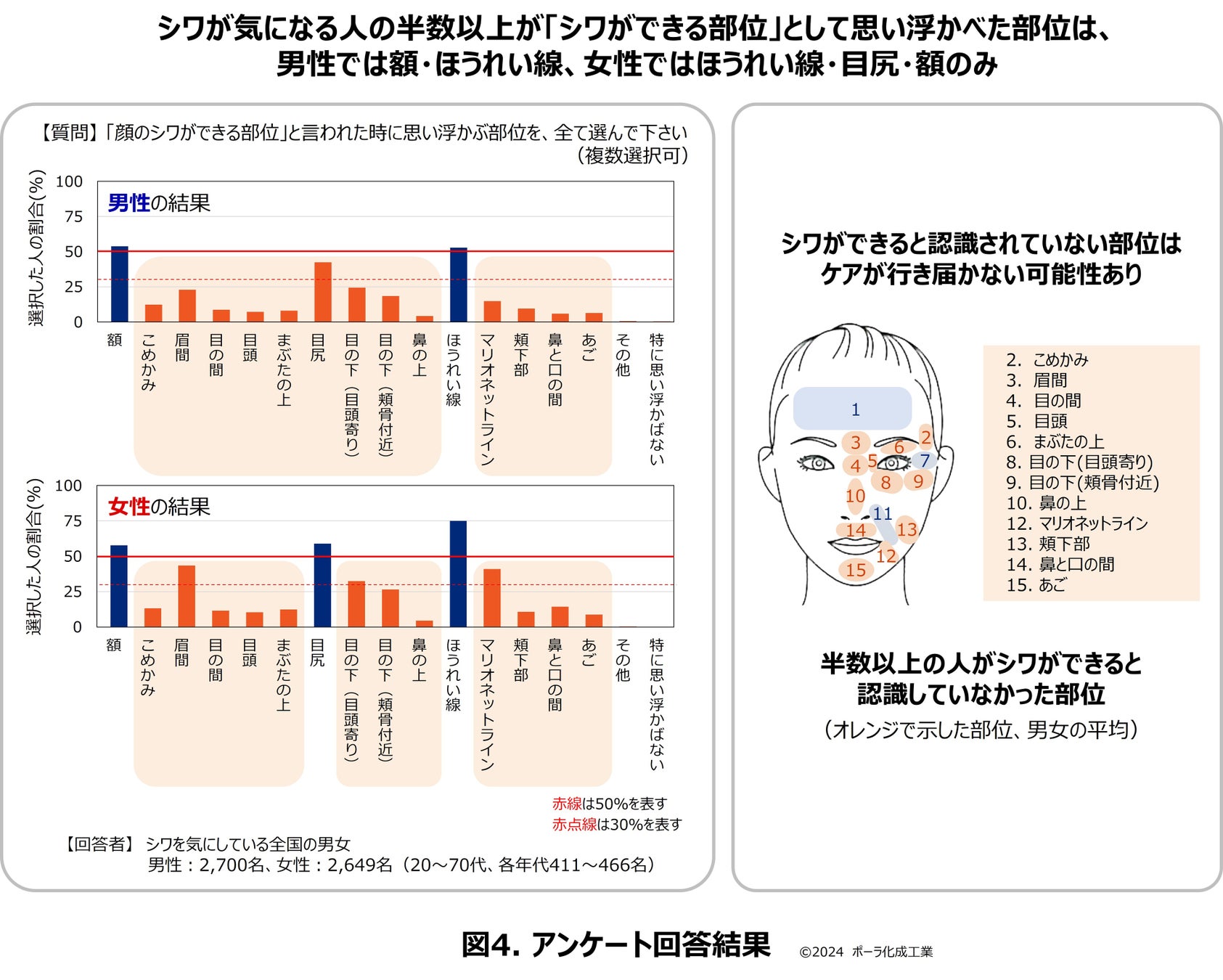 シワを気にしていると回答した全国の男性2,700名・女性2,649名(20~70代、各年代約450名)に調査を行いました。ポーラ化成工業のこれまでの研究においてシワが確認されている15カ所を示した顔のイラストと、部位ごとの名称を示し、シワができる部位として思い浮かぶ部位を全て選んでいただきました。