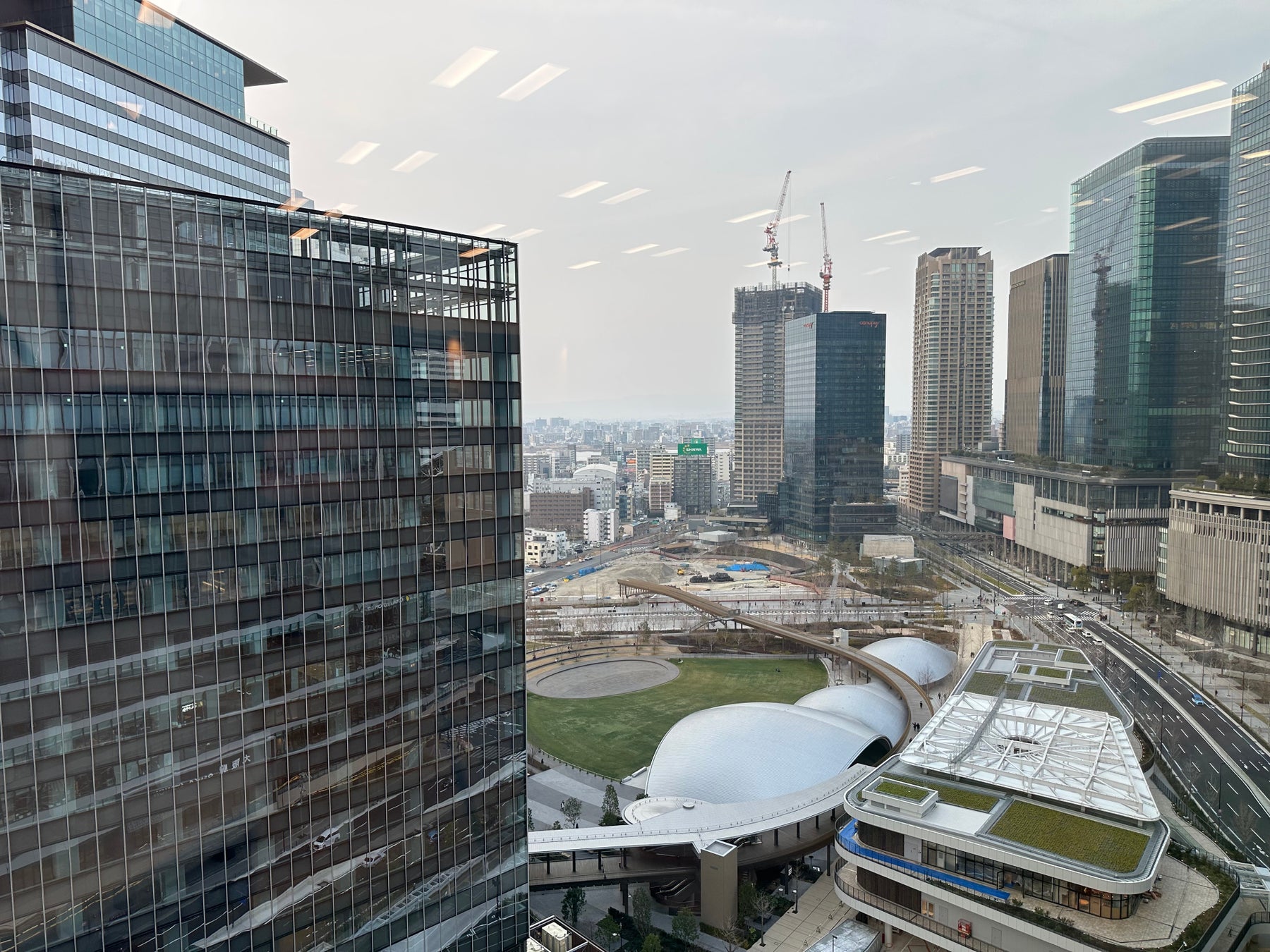 25年3月にオープンするグラングリーン大阪、エキスポが開催される大阪湾岸エリアを見晴らす眺望を活かすために壁を設置せず家具でゾーニングするオープンな空間としてデザインしました。