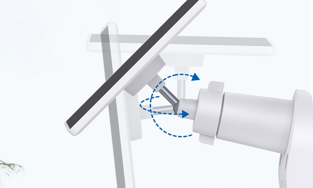ソーラーパネルの台座は角度調整が可能なので、壁面や屋上などでも場所に応じ光がよく当たるように調整できます。