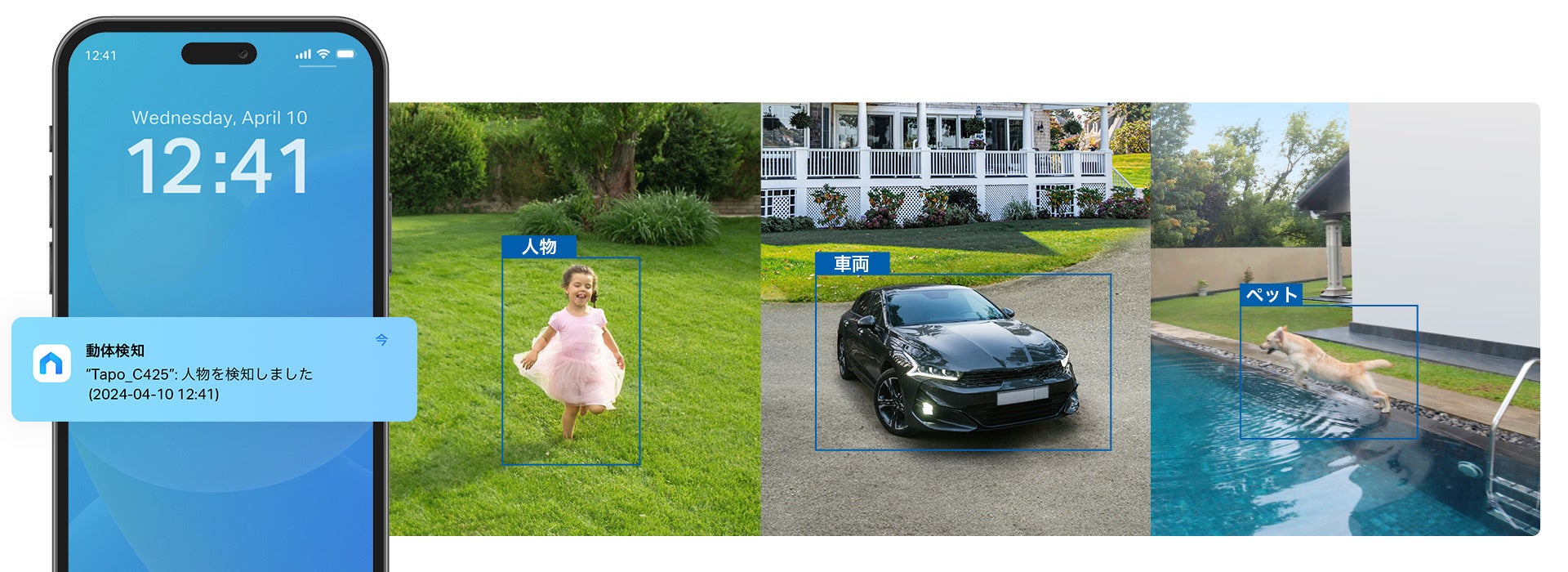 ・スマートAI検知:誤検知による不要な通知を低減しながら、カメラが人物・ペット・車両を正確に検知してアプリでお知らせ