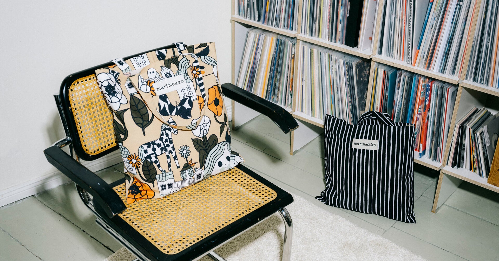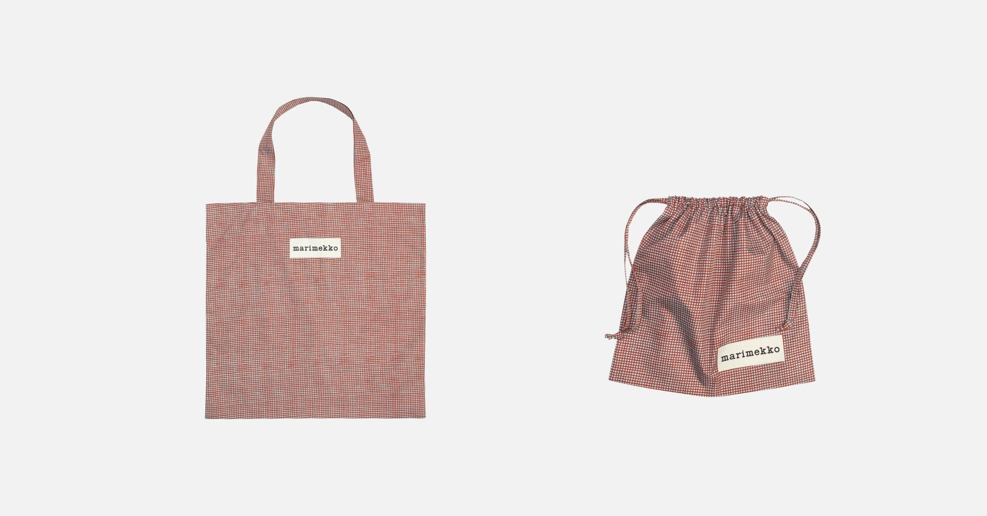 右: マリメッコの過去のコレクションの残りの生地を使用した、コットン素材のトートバッグ。*残布を使用しているため、柄はアソート。5,500円(すべて9月30日表参道店先行発売 / 10月14日対象全店発売予定)