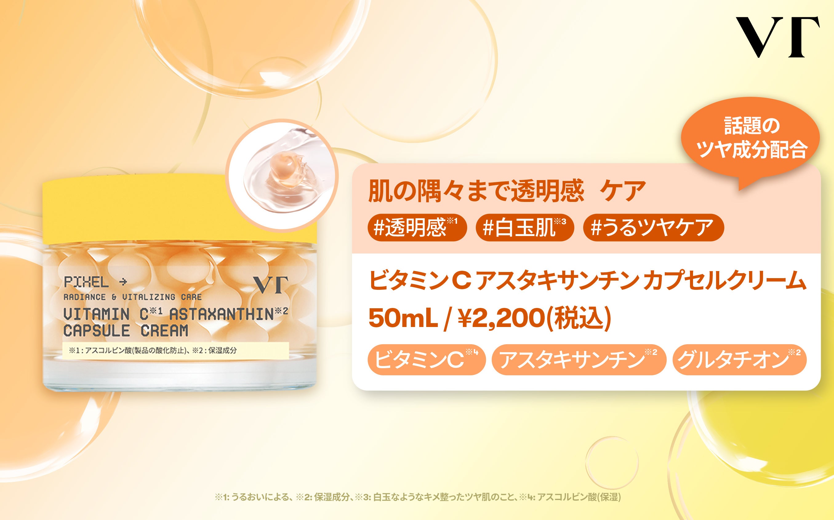 ビタミンC※2アスタキサンチン※3を配合。うるおいを与えながら、透明感※1のあるツヤ肌へ導きます。
