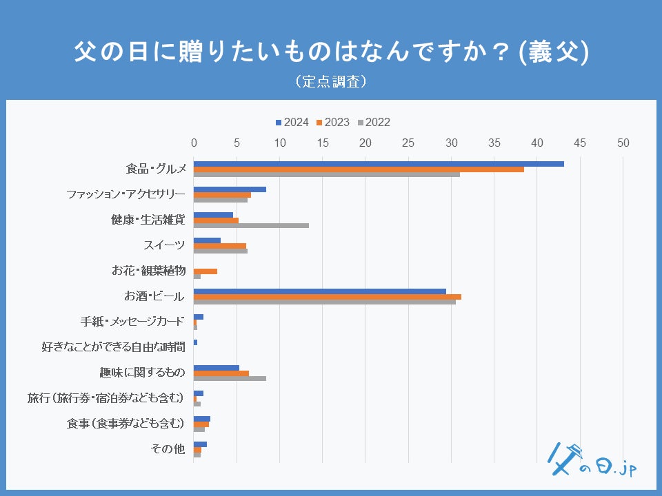 義父へ贈りたい父の日ギフトでは、「食品・グルメ」、「ファッション・アクセサリー」は年々増加していることが見て取れます。「好みが分からず気に入ってくれるか不安」という回答が多いことから、父の日ギフトの種類が定番化していることが推測できます。
