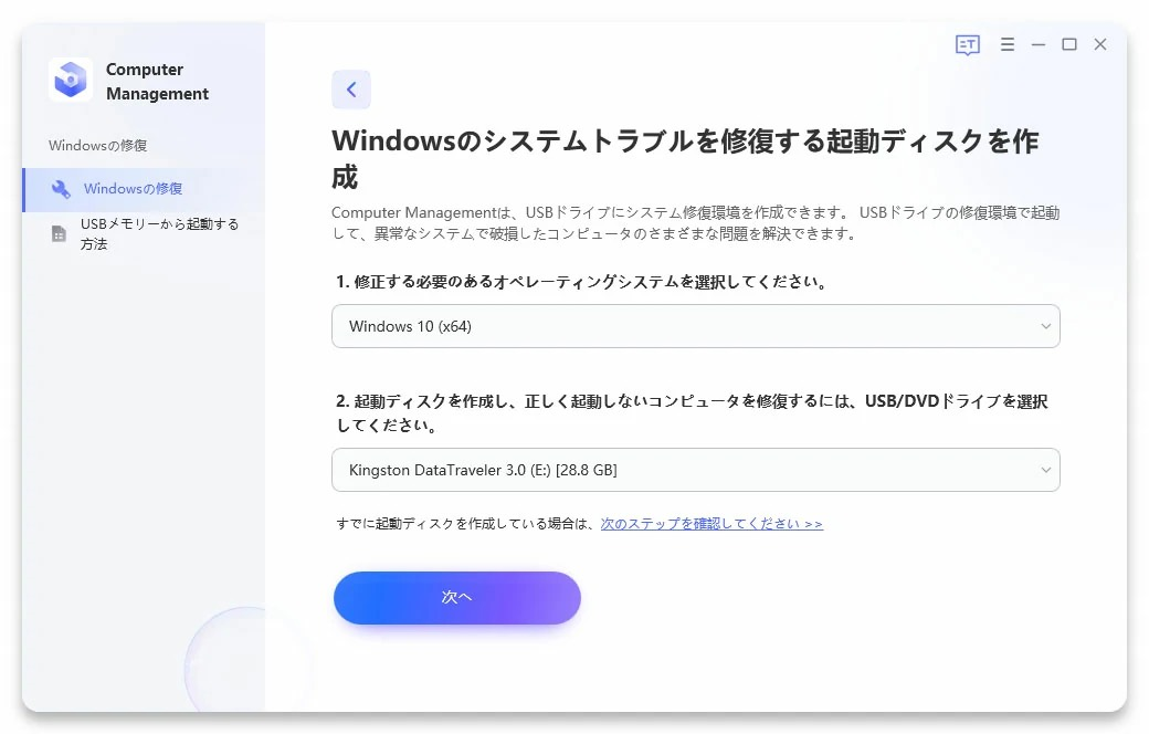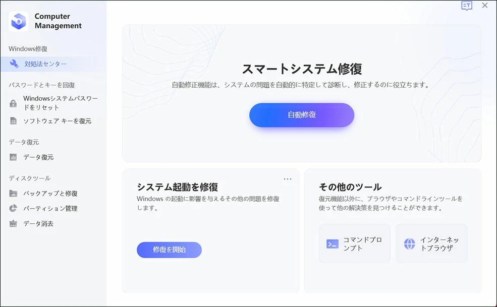 まずご紹介するのが、Windowsシステムの修復専門ツールであるPassFab Computer Managementを利用する方法です。PassFab Computer Managementは、Windowsのシステムに発生している問題を自動で検知して修復できるツールで、画面上のシンプルな操作ガイドに沿って簡単に利用できますので、PC操作に不慣れた方にもおすすめです。