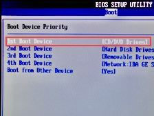 Step3:作成した起動ディスクを起動できないPCに挿入して電源をつけ、ロゴが表示されたらF2キーなどを押してBIOS設定画面を開きます。矢印キーと+/−キーを使って、作成した起動ディスクの優先順位を一番に変更し、PCを起動ディスクから立ち上げます。