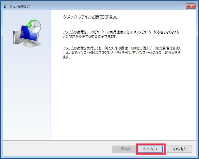 Step3:「システムファイルと設定の復元」画面で「次へ」をクリックすると復元ポイントの一覧が表示されますので、復元したいポイントを選択して、画面の指示に従います。再起動して、問題が解消されているか確認します。