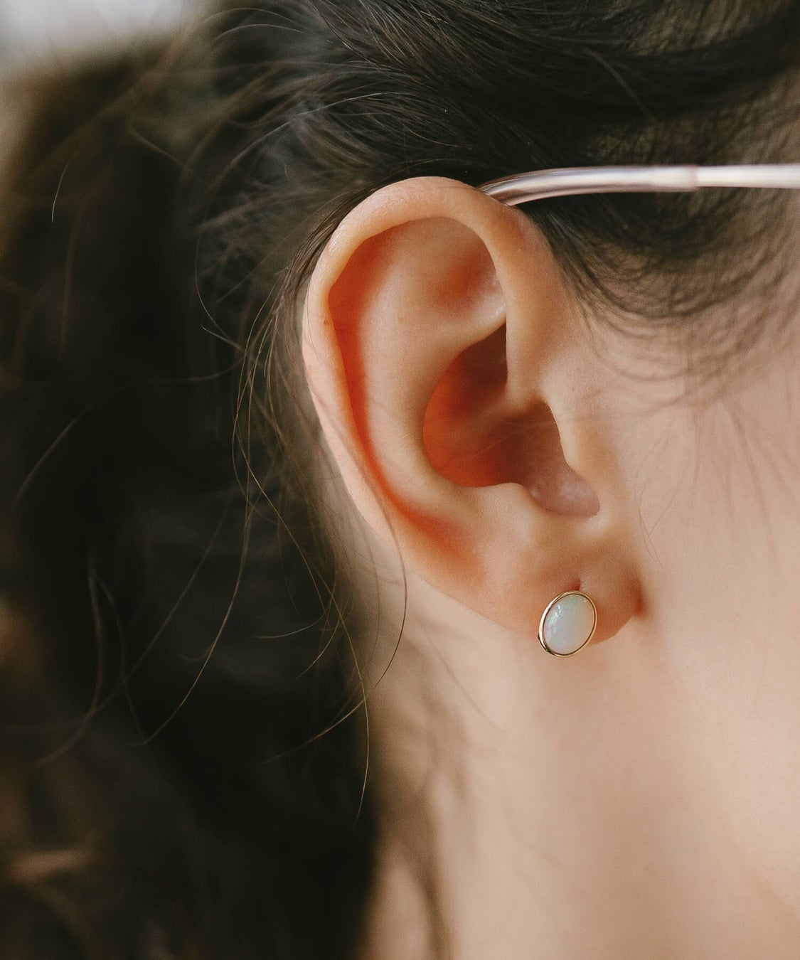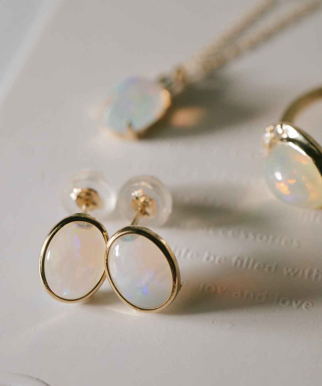 【早割1,000円OFF】乳白色の中にひそむ、複雑な煌めきを放つK10オパールピアス。